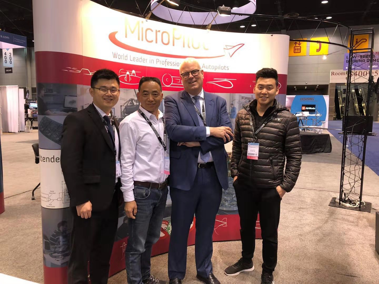 Micropilot总裁Howard Loewen(右二)与无人机网人员在美国2019无人系统展合影
