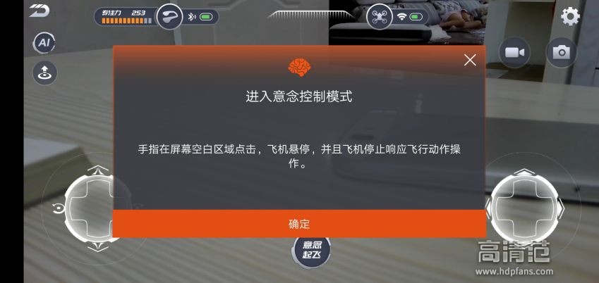 APP界面非常简洁易懂,所展示的画面为无人机前方镜头所拍摄的实时画面。在未连接意念机时,默认起飞方式为“手动起飞”,点击左上角的表示起飞的小图标就能完成操控。