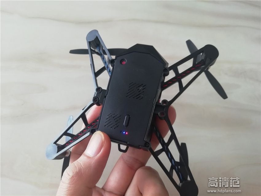 无人机的底面还是很有料的。不但有无人机的开关、状态指示灯、散热孔,还有一个高度探测仪。这款看似小巧的无人机,其实配置还是比较丰富的。