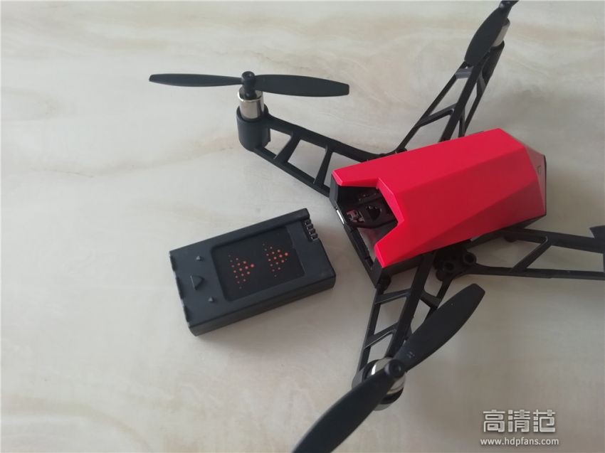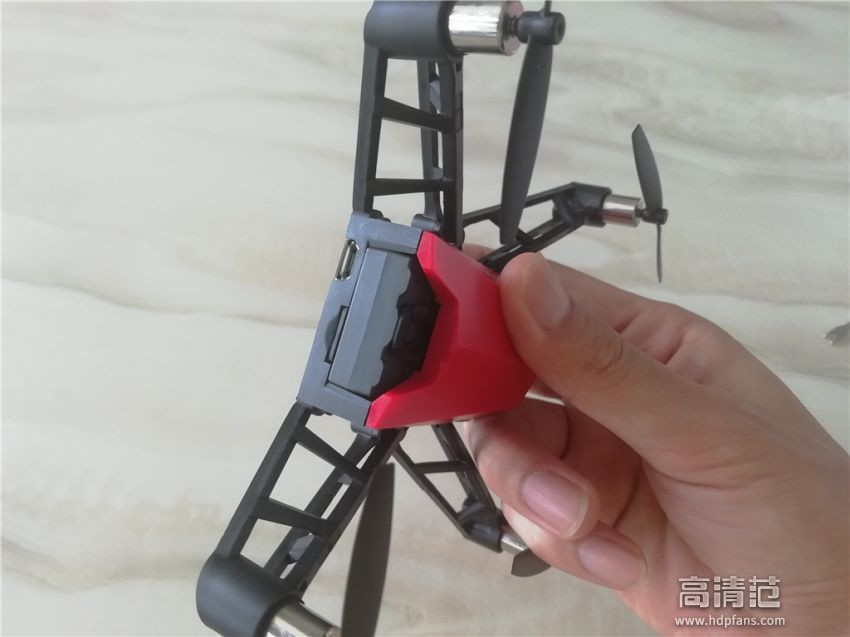 Drone无人机的尾部是电池仓,在电池的下面有一个充电接口和一个TF卡扩展插槽。这款无人机自带摄像头,除了可以实时图传之外,还能够把录像存储在内置的TF卡里。