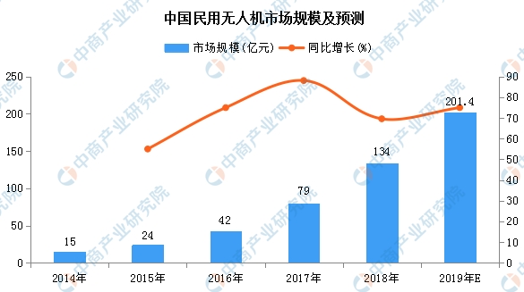 凭借着易部署、安全、便捷等特点。不仅能在消费层面上,提供航拍、竞技等娱乐活动,同时在工业层面上能提供数据采集,运输物品的功能。目前,无人机主要应用领域为能源、农业、警用、基建、救灾、商业、医疗以及个人使用。据数据显示,2015年中国民用无人机市场销售规模达到24亿元。随着无人机应用领域的逐渐扩大,无人机市场需求逐渐提升,2018年突破100亿元大关达134亿元。国内民用无人机市场潜力十足,预计2019年市场规模或超200亿元。