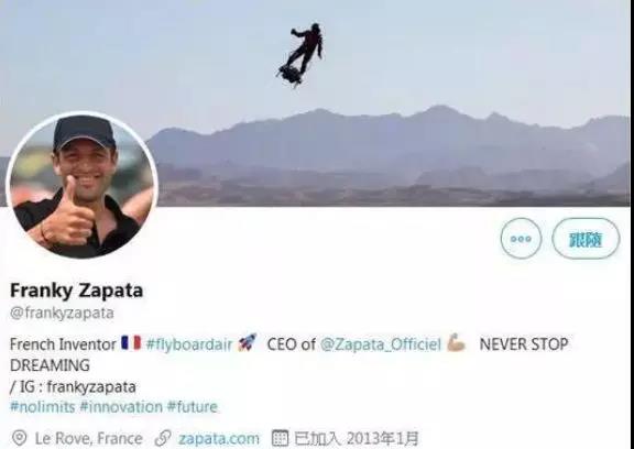 据介绍,法国人弗兰基·萨帕塔(Franky Zapata)是萨帕塔赛事公司(Zapata racing)的创始人,他此前发明的喷水飞行器飞行滑板(Flyboard)受到世界各地极限运动爱好者们的欢迎。