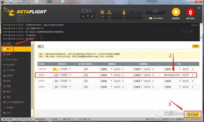③ 烧写完成后,连接进入“端口”选项,找到连接TF雷达的UART口,在“外设”中选择“Benewake LIDAR”,最后点击“保存并重启”。