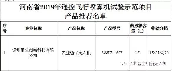 近日,河南省农业机械技术推广站最新通知显示,《河南省 2019 年遥控飞行喷雾机试验示范项目产品推荐名单》符合要求的企业及产品名单的通知,予以公告。深圳星空3WWDZ-16SF农业植保无人机产品符合要求,产品入选补贴目录。据了解,深圳被喻为世界无人机之都,深圳无人机企业入围河南补贴目录共有3家。