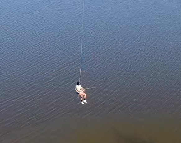 男子手拿钓竿,连人带椅腾空飞起,头顶的无人机缓缓移动,到了湖中央后,男子竟然突然抛竿开始钓鱼。