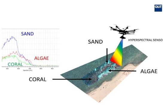 项目主导人Felipe Gonzalez说:“健康的珊瑚与不健康的珊瑚在光谱层面上的显示是不同的。”普通的相机只能采集到被测物的红,绿,蓝三个波段的数据信息。但是本次项目中利用的探测器是拥有270个波段通道的高光谱成像仪。它采集到的数据将展示给人们看不到的一些被测物的本质。这项技术同时也被美国国家航空航天局(NASA)应用在喷气式飞机上来拍摄大堡礁并采集其光谱数据。