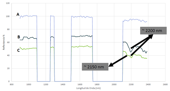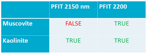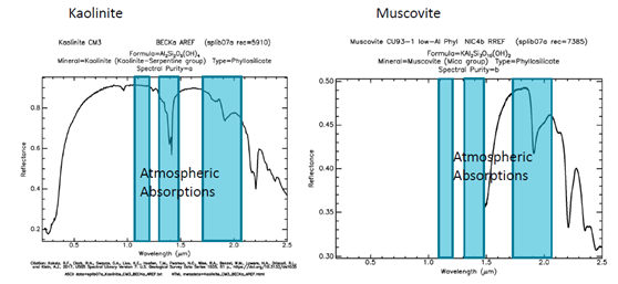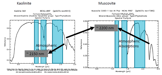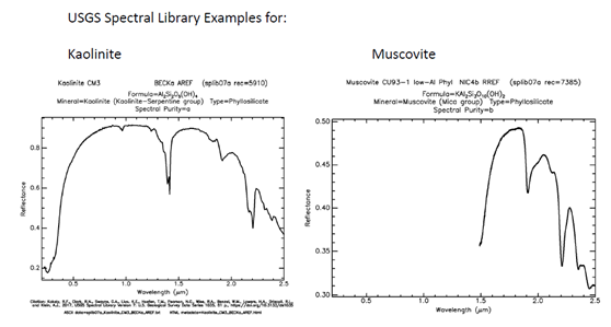 光谱库中高岭石和白云母两种不同的矿物质的光谱形状在2150nm波长与2200nm波长范围内有着显著的差异。