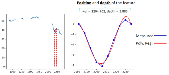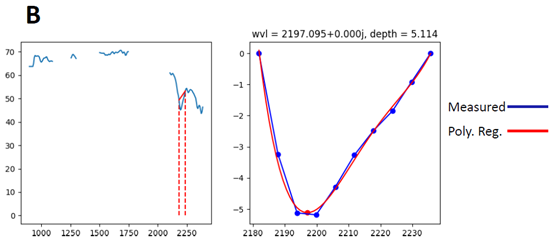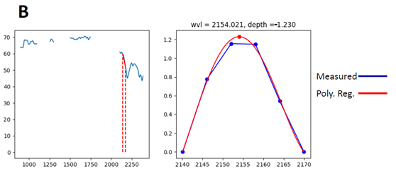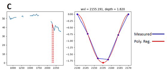 在对感兴趣目标区域进行细致研究的时候,每个像元的不同波长上的反射率值是离散的。进一步研究需要将离散的值做局部线性回归。这样才能得到一个有研究意义的波形。观察不同成分区域生成的反射率曲线图,找到在哪个波长范围内的波形有显著的不同(在差异不明显的时候可以通过积分将波形差异增大以便观察)。