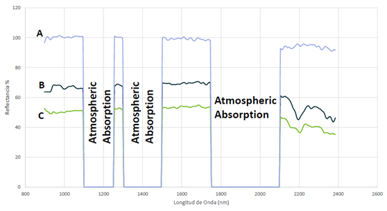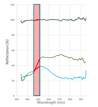 如上图所示,不同被测物在520-560nm波长范围内形成的反射率曲线斜率有显著的不同。这种差异就可以用来区分被测物的物种。