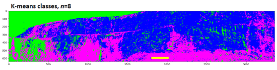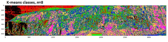 这样一来,通过高光谱可以分辨出两种不同的矿物质,并且可以清楚的看到他们分别在图像数据中的分布情况。