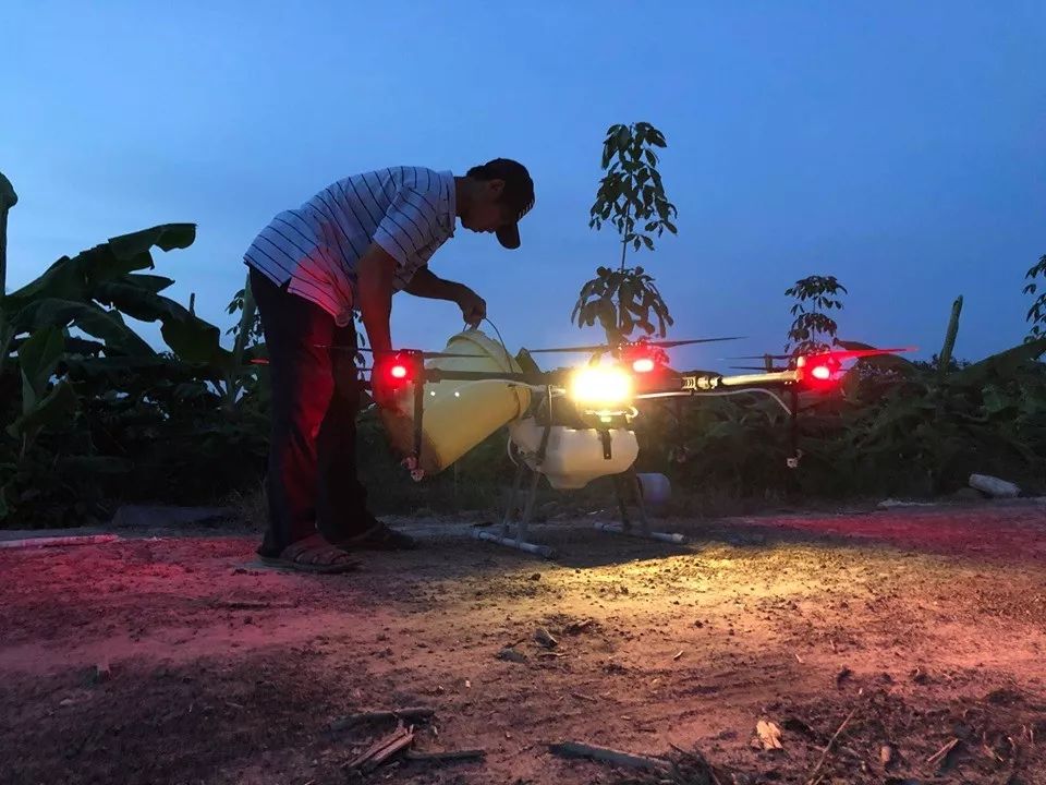 夜晚 7 点 35 分,越南河内郊外一处香蕉园中,一支年轻的植保队正在进行植保作业。在将药液倒入水箱后,资历最深的当地飞手 Vu Nguyen让周围人稍稍后退,继而双手拨杆,熟练地操作着 MG-1P 植保无人机,完成当日最后一次喷洒。
