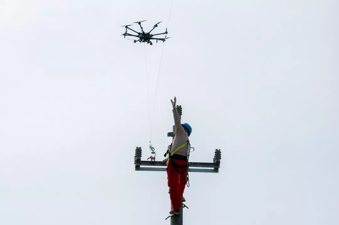 “配网施工无人机放线”赛是团体作业,考验飞手和塔上人员的配合能力。