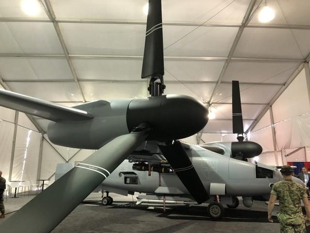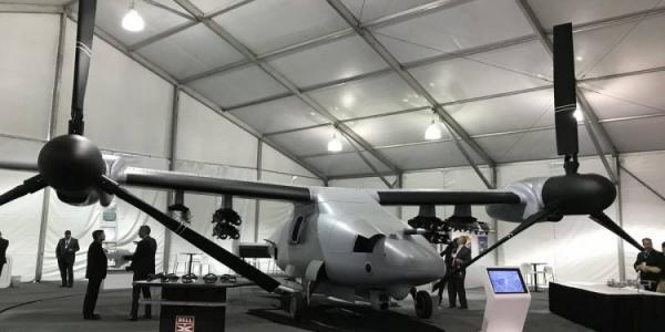 虽说目前展示的仅为全尺寸模型,不仅是展示了许多细节,也证明它是世界上最大的无人机之一,不比有人驾驶的直升机小什么。外观与V280非常类似,采用V尾,在机翼的两边末端加装了两个可以进行90度旋转的发动机舱,机腹设有内置弹舱。在停放时,机翼可以像V-22那样转动90度,并将外翼折起,以利于舰载使用。