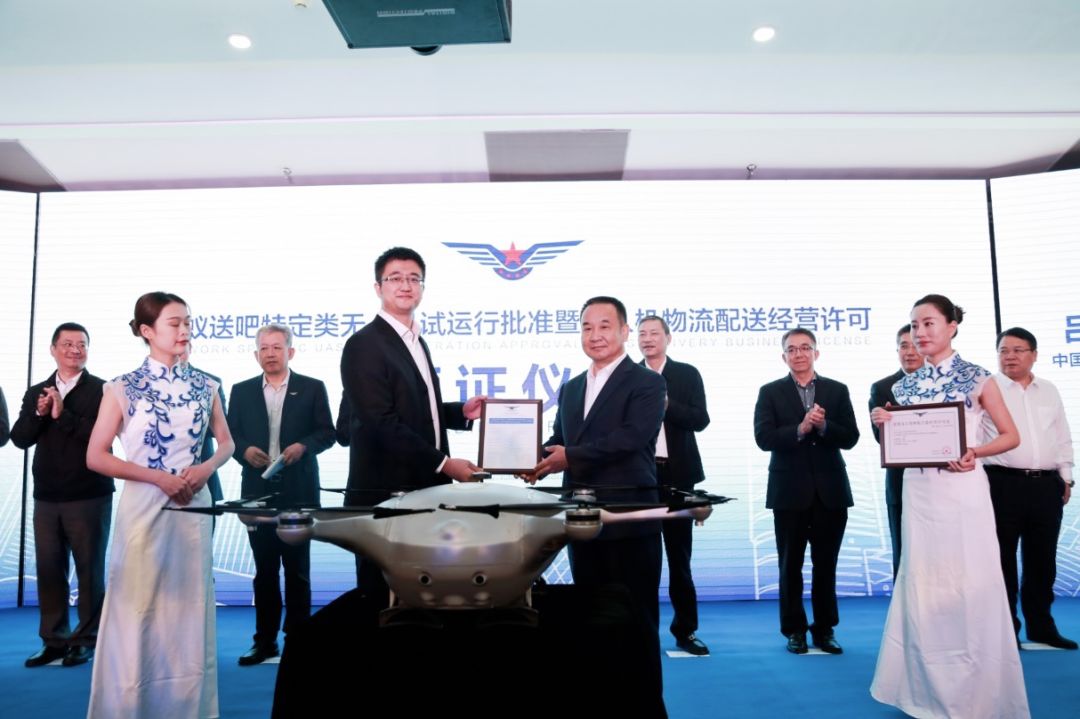 10月15日,中国民航局吕尔学副局长向迅蚁全资子公司杭州送吧物流科技有限公司CEO章磊颁发《特定类无人机试运行批准函》和《无人机物流配送经营许可》。