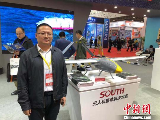 广州南方测绘科技股份有限公司董事、中国测绘地理信息学会副秘书长缪小林向记者介绍无人机功能。 朱晓颖 摄