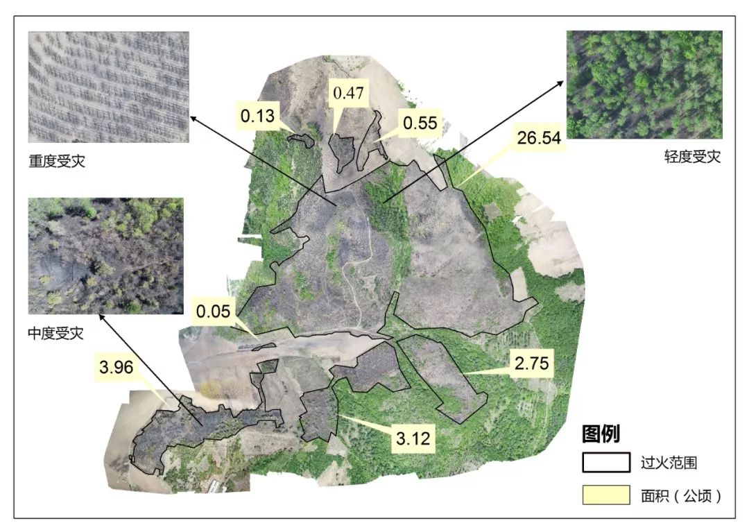 左图为灾前遥感影像(2019年5月4日),右图为灾后遥感影像(2019年5月9日),图中黑色区域为过火范围。