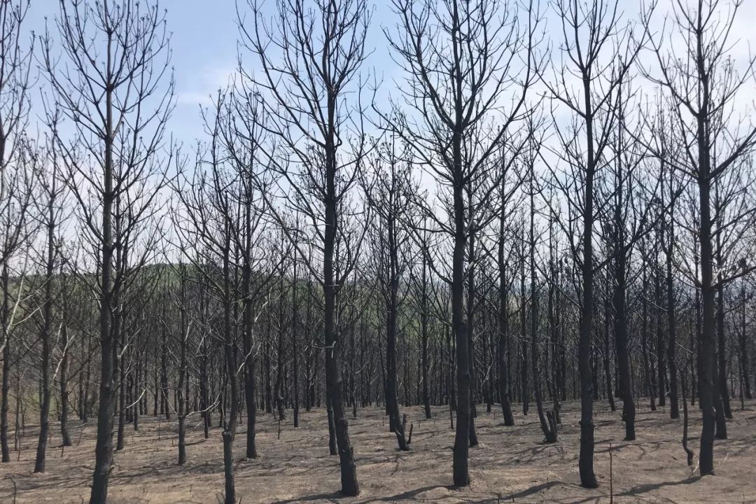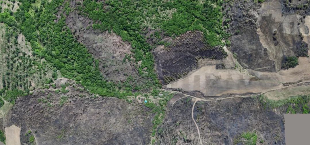从模型中可以看出,植被整体恢复效果明显,但重灾区域树木仍未恢复,虽然地面杂草茂盛,但火灾痕迹清晰可见,树木受损严重。
