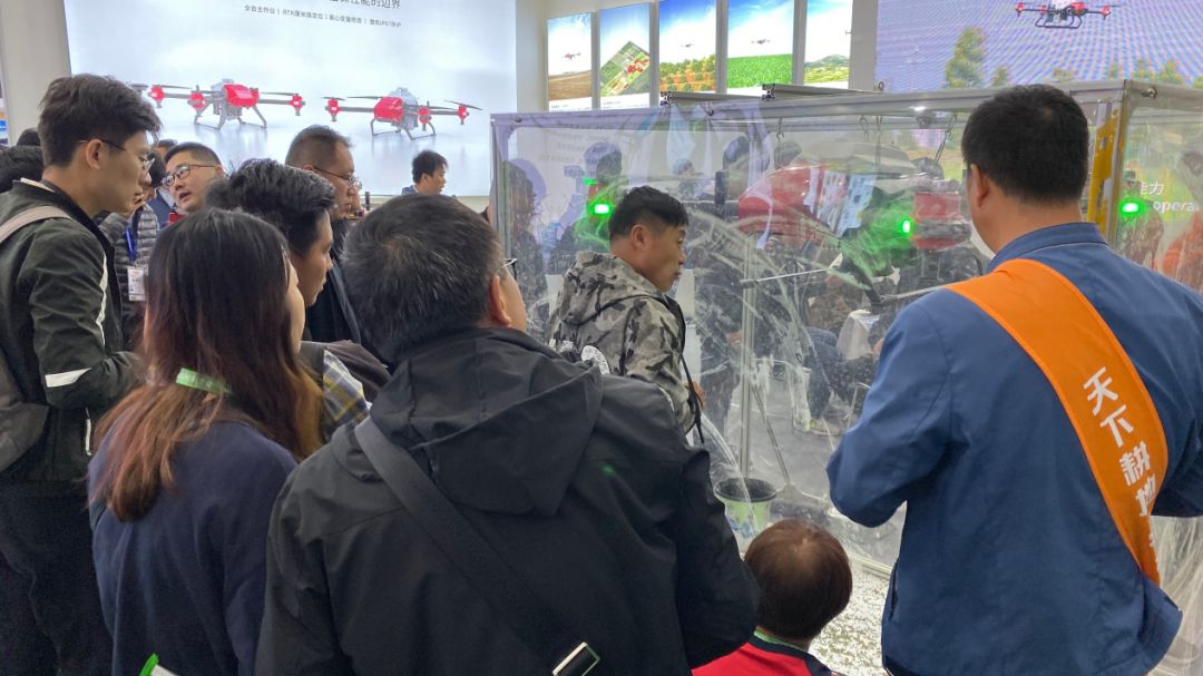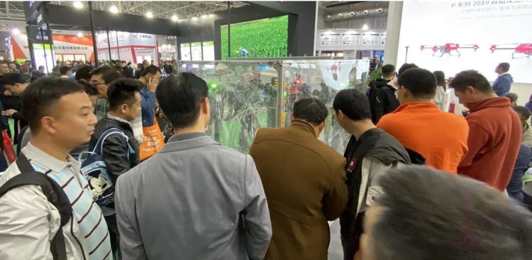 在 N5 馆 N5046 展位,极飞科技凭借高颜值的展位外观和独特的立体悬挂式的产品造型展示,吸引了无数观展农机人及展商的注目,我们的飞机和现场工作人员被参观人群团团包围了。