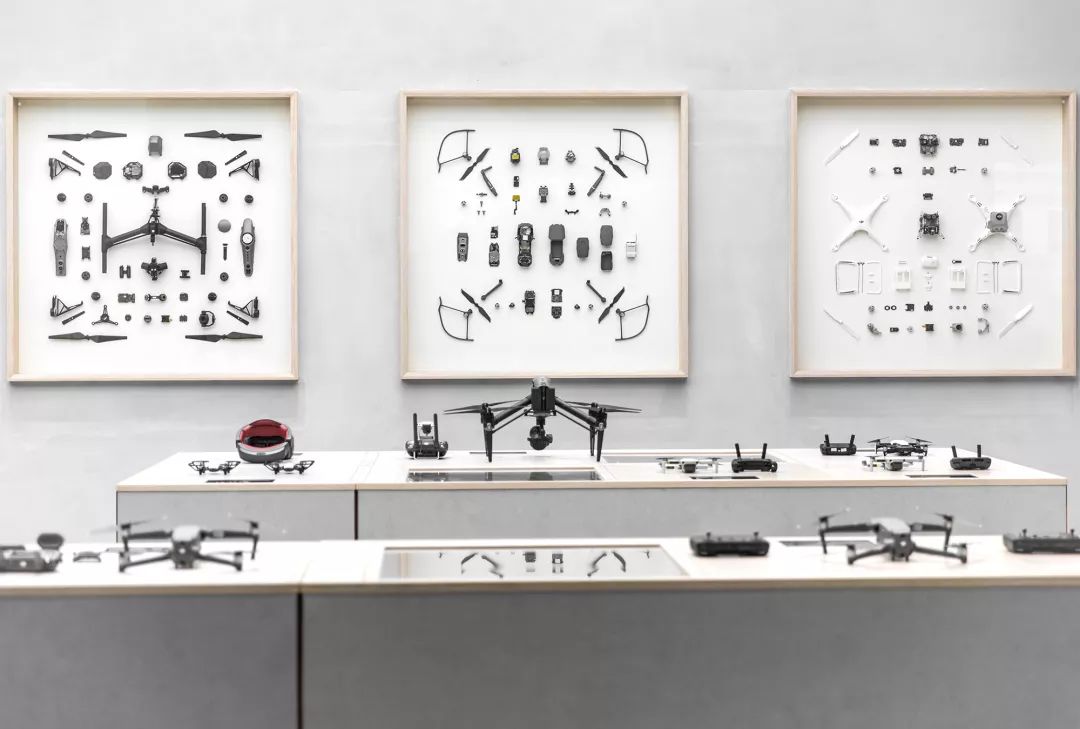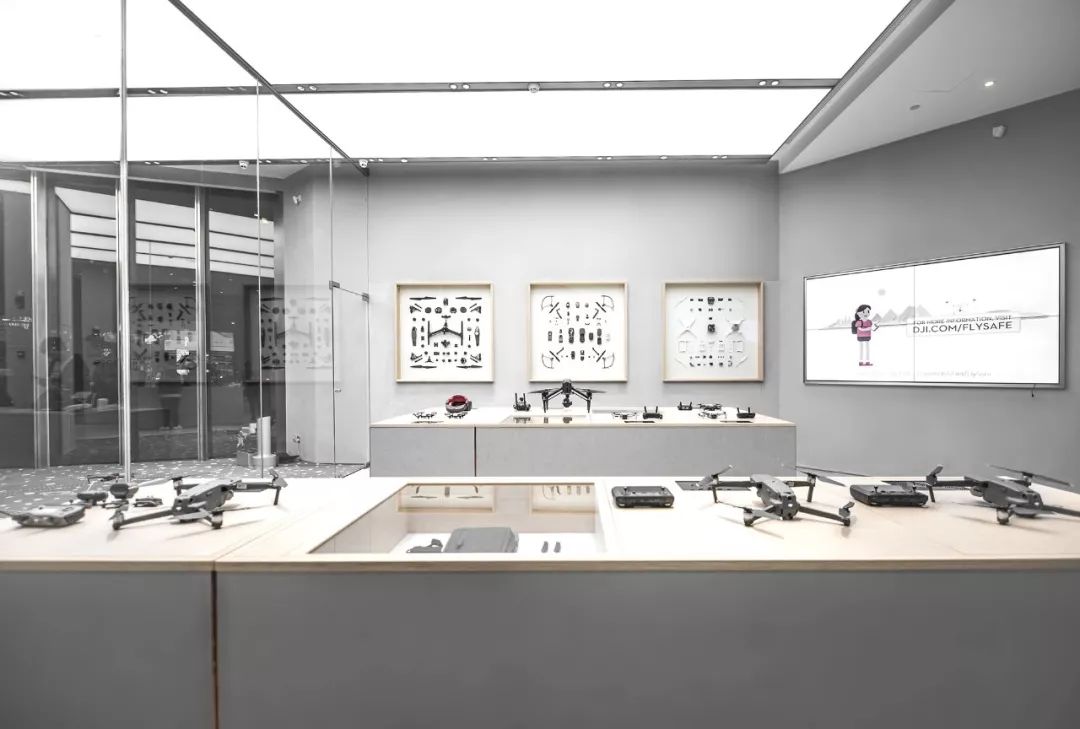 步入旗舰店首层,御 Mavic 系列、灵眸 Osmo 系列、机甲大师 RoboMaster 等消费级产品随即映入眼帘,相应附属设备一应俱全。