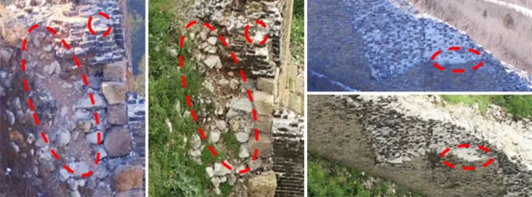 同一长城地段不同时间拍摄的图像还可以前后比较,以监测残损变化、掌控长城保存动态。例如图15反映出该蓟镇东部辖敌楼在两年中所受台风、雨水自然侵蚀造成的显著变化。除了发现少量砖石砌块掉落,细微土石颗粒流失是更为严重的问题,细颗粒物的流失直接导致大块砖石失去填充支撑而迅速瓦解。