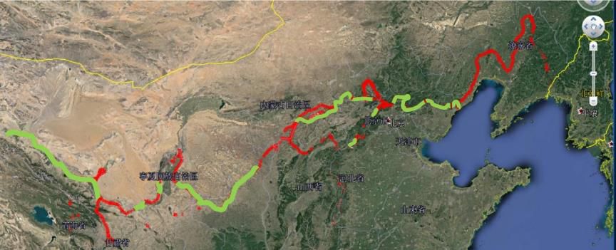 图3 明长城走向(红色)及高清图像已覆盖区域(绿色)