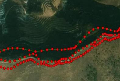 主要外业方法是人员携带微型无人机沿长城线逐段超低空慢速飞行(约15-25公里/小时),在20-50米相对高度从长城顶部、内侧、外侧三个方向拍摄(图1),获得同一航线内相邻图像重叠率不低于70%的三航线连续高清图像集(实际照片空间位置、分布、密度如图2示意),再利用无人机图像本身带有的GPS坐标信息及摄影测量手段,实现墙体本身与内、外侧微地形的三维测量;在此基础上,引入图像类机器学习技术实现对海量图像的半自动筛选、分类、检索,主要用于分析长城构造、开展病害监测、支撑长城国家文化公园建设等目的。