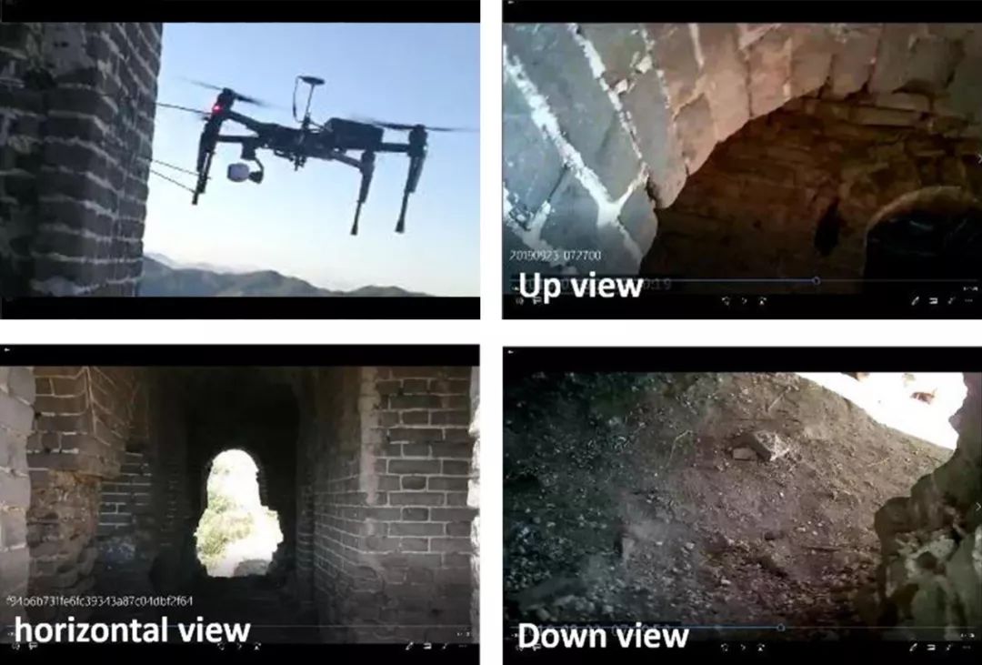 空心敌楼室内空间是无人机图像采集的“盲区”,是低空设备无法替代地面人工视觉检查的重要原因之一,然而敌楼多矗立于山峰峭壁之上,人工攀爬调查又极为费时费力。针对这一难题,实验室设想了多种解决方案并初步实地尝试,目前已经能够从箭窗探查敌楼室内,从上、中、下等不同的视角采集室内图像,若从多个箭窗向一敌楼内多视角探查,可在避免人员攀爬的前提下,快速认知敌楼内部空间、结构、保存状态等(图7)。