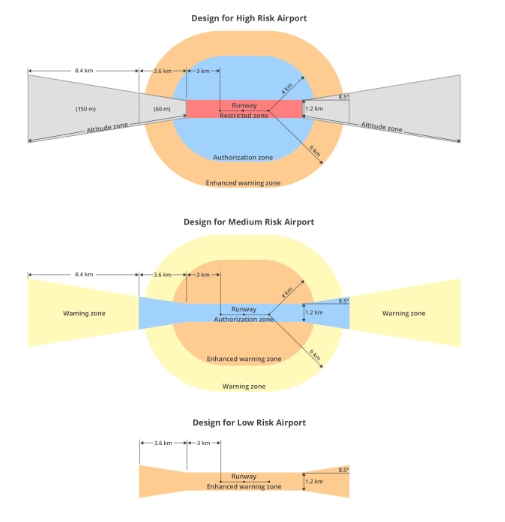 据了解,新版地理围栏会根据机场大小,使用三种不同大小的禁区。除了限制无人机在跑道周围椭圆形区域的飞行外,地理围栏还包括机场两端的高度区。而三维区域意味着一旦距离飞机跑道足够远,用户就可以在较低的高度使用无人机。