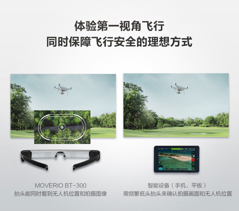 目前,该款无人机飞行眼镜允许用户使用大疆无人机的飞行控制器,适用于精灵 Phantom4 Advanced、精灵Phantom4 Normal、精灵Phantom4 Pro、晓Spark、悟Inspire1、悟Inspire2、御 Mavic Air、御 Mavic Pro、御 Mavic Pro2及经纬 Matrice 100等多种机型。用户只需 在BT-300上安装相应无人机机型的APP并注册账号,通过USB数据线将BT-300与无人机遥控器连接,顺利配备后即可进行无人机飞行眼镜竞速操作。基于此合作的便利性,新人用户可借以遥控器充分磨炼无人机飞行技巧,让无人机头显竞速技能精益求精。