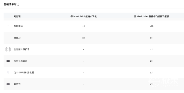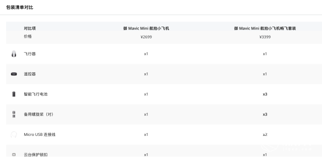 *套装额外多了2个电池、2对备用桨、1条USB线、12个小螺丝、1套全向桨叶保护罩、充电管家、1个DJI 18W USB 充电器、1个手提包。700元买这堆配件绝对值,真香。不得不提,DJI care毕竟只要269元,给了你两次炸机的机会,买!