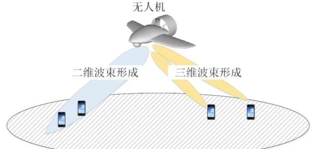 (4)3D MIMO与毫米波通信:由于无人机的空中位置及其在特定位置的按需部署能力,它们可被看作是飞行天线系统,利用它们可以进行大规模MIMO、3D MIMO和毫米波通信。例如,近年来,业界对于在地面蜂窝网络中使用垂直和水平维度的3D MIMO(也被称作全维度MIMO)有着巨大的兴趣。如图3所示,3D波束形成可同时在三维空间创建多个独立的波束,从而减轻小区间干扰。相比传统2D MIMO,3D MIMO解决方案可以产生更高的系统总吞吐量,且能为更多用户提供支持。一般来说,3D MIMO更适用于这样的场景:用户数量多而且这些用户以相对于其服务基站不同的仰角分布在三个维度上。由于无人机携带的飞行基站的高度高,根据相对于无人机的不同高度和仰角可以很容易地辨识地面用户。此外,无人机载基站是利用3D MIMO的适合候选方案。