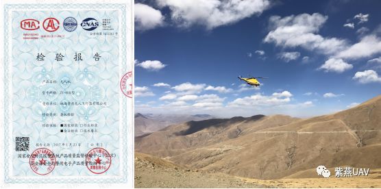 2017 年初紫燕800系列在西藏飞越 5100 米海拔,成为中国第一家无人直升机类获得公安部一所全项检测报告的厂家。