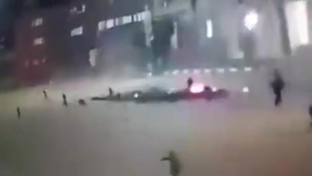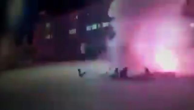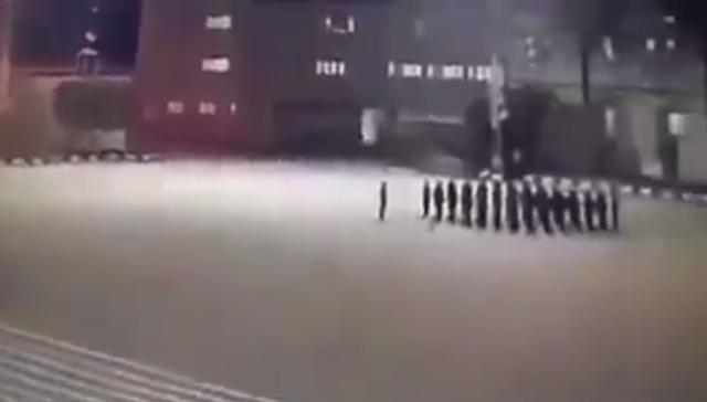 当时操场另一侧有人用手机拍摄列队集合的画面,因此恰好将空袭爆炸全程录下。只见人群中忽然炸开一团巨大的红紫色火光,瞬间硝烟冲天,几十人应声倒地,只有少部分人跌跌撞撞四散逃开。