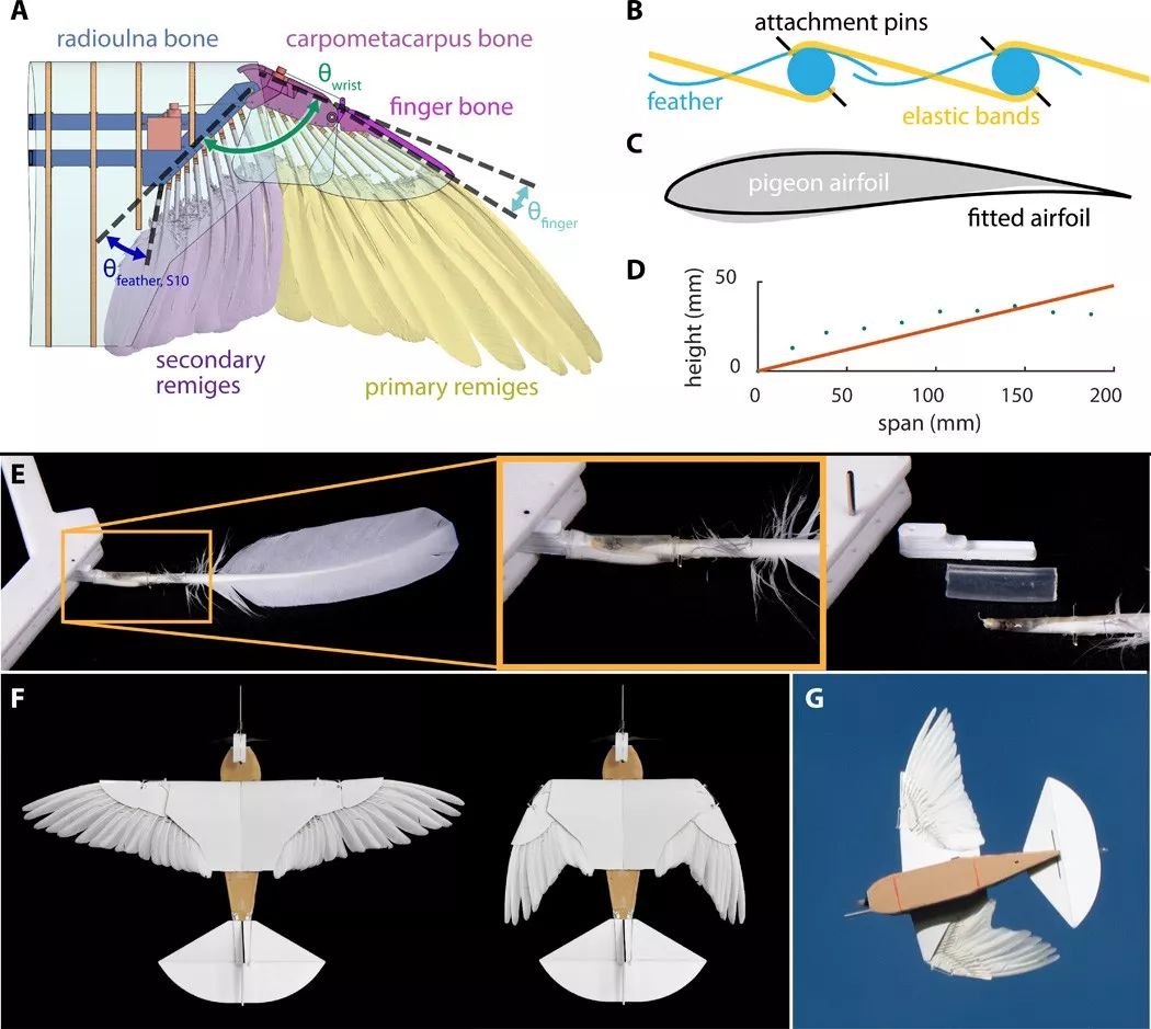 鸽子无人机借助自己的混合系统进行操控,而推力和额外的稳定控制来自推进器和传统型尾翼。这个鸽子无人机的翻转可以仅通过翅膀上的指关节运动来控制,而且这项技术比传统飞行器用到的副翼横滚要稳定得多。