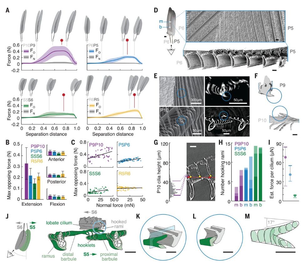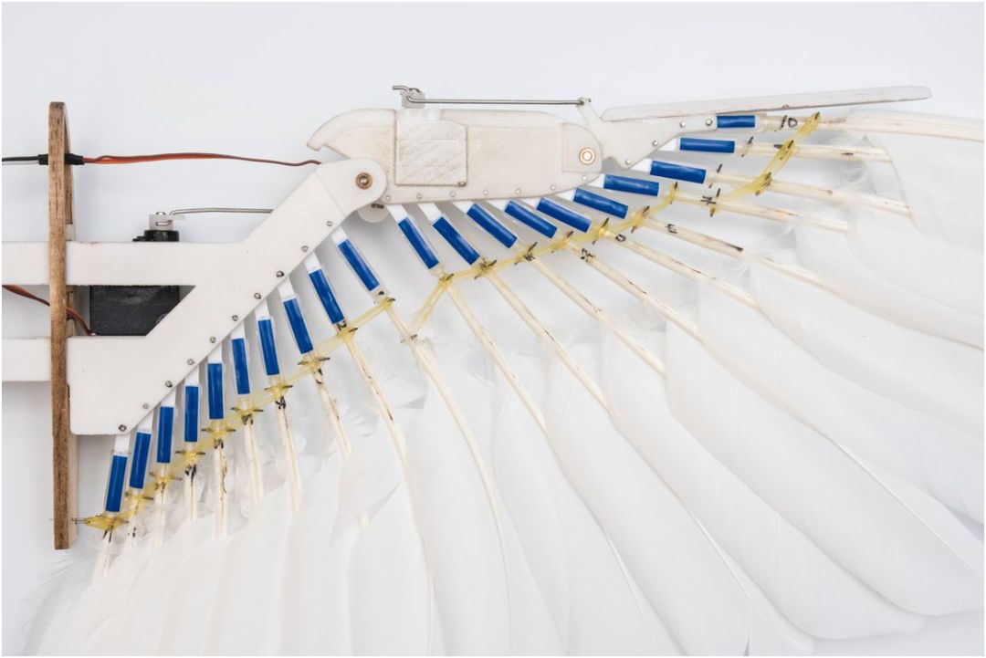 研究小组还研究了鸟类如何使翅膀变形的机理,鸟类羽毛的单独控制更多的是自动而不是手动。而且,羽毛上微小的微观结构形成了一种单向尼龙搭扣式的材料,可以使这些羽毛形成一个连续的曲面,而不是一堆互不相连的曲面。真实的鸟类翅膀是非常灵活的,可以改变形状,大多数鸟类都可以将翅膀向后折叠,以此来减少表面接触面积。这样一来就可以根据飞行状态灵活切换,长翼用来高飞和转弯,短翼用来调整速度。