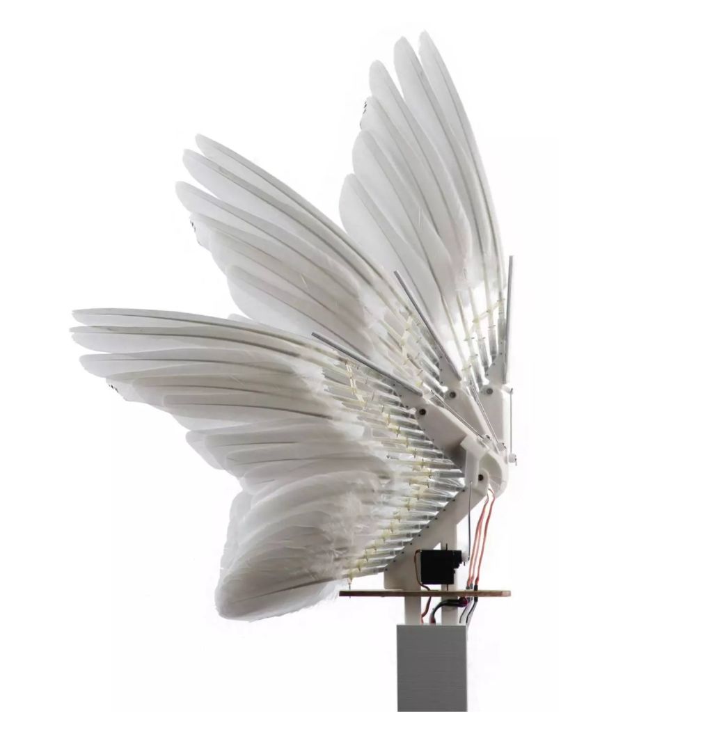 鸽子机器人羽翼主体包含四部分:肱骨、桡骨、尺骨和前肢。使用真实羽毛解决了羽毛的制造难题,但需要想出一种方法来协调所有羽毛之间的复杂关系,正是这种相互作用在控制着真实鸟类的翅膀形变。