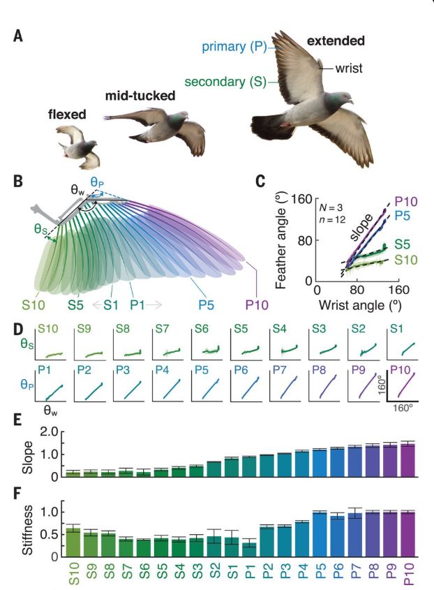 通过研究风洞中的鸽子翅膀,研究人员发现鸟类腕和爪的动作可以很好地控制羽毛的位置,翼展和面积。在飞行测试中,鸟类手腕和手指的操纵引发了小角度的稳定转弯动作,研究人员说,这提供了一些最初的证据,证明鸟类主要使用这些精巧的数字语言来操纵飞行。