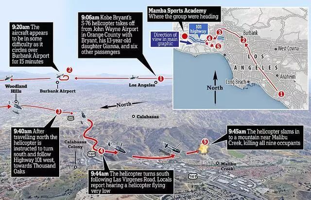 上午9点20分左右,直升机在格伦代尔附近的5号州际公路以东盘旋了大约15分钟。空中交通管制员让这架直升机为其他飞机停留了大约11分钟,然后让它沿着5号州际公路向北飞行,穿过伯班克的领空。