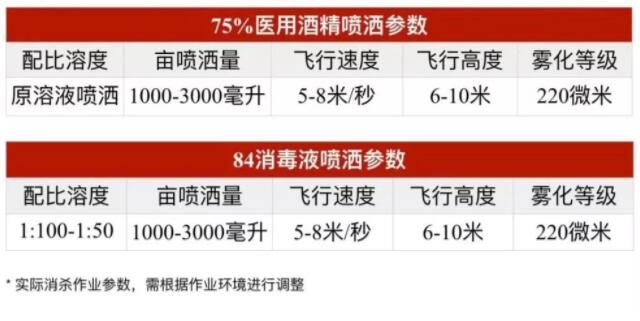 目前,城市街道、社区、农村喷洒的消毒剂主要是84消毒液(一般有效的氯浓度为4%-7%)和 75% 的医用酒精。极飞防疫专项组根据过去与中国疾控中心、拜耳环境科学等合作机构开展的防控试验成果,及此前参与的抗震救灾消杀经验和各地防疫效果,建议采用药液配制方法和喷洒参数如下:
