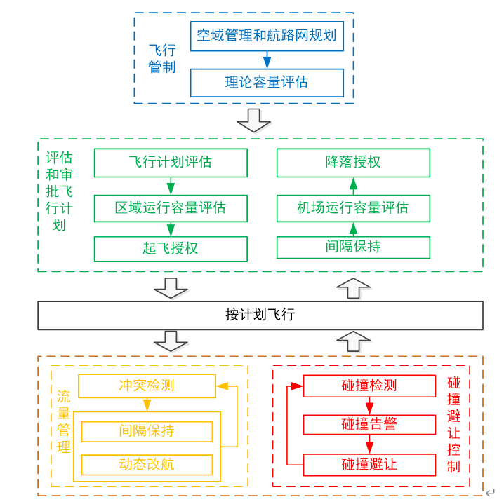 如图3,无人机飞行管理主要包括如下内容。1)在基于空域管理和航路网规划时设定安全边界和间隔。可以认为在飞行区域和飞行航路上进行事先的限制。这里还包括动态设置禁飞区隔离空域中的无人机等。2)评估和审批飞行计划,调整起飞授权放飞时间和降落授权。在计划申报阶段,通过与飞行计划申报相结合,预估未来较长一段时间内的空域容量,对飞行计划进行审批和授权,即飞行计划容量控制。另外,在起飞阶段(考虑机场与航路),通过计算当前运行容量,对放飞申请进行授权,即起飞授权容量控制。飞行计划包括无人机的飞行航线,可以是人为设定的,也可以是起飞前航线进行自动规划。除此之外,还包括在降落阶段(考虑机场容量),对降落申请进行授权。3)流量管理:动态航线规划和飞行速度控制,使空中无人机之间保持一定的安全间隔。在运行阶段,结合多种异常情况,包括交通管制、异常天气、障碍物等产生的实时冲突,或者根据航路和机场的运行容量,进而触发流量管理。这个时候冲突预计发生的时间较长(比如分钟级别),通过动态航线规划和飞行速度控制修正来消除冲突。4)碰撞避让控制:调整飞行速度和飞行方向进行障碍(危险物)避让。这个时候冲突预计发生的时间较短(比如秒级别),碰撞即将发生。这时对于无人机可以采用边缘计算技术,地面管控系统对无人机进行实时避障控制,也可以通过机载V2V系统广播碰撞信息,无人机进行自主避障控制。由此以上的技术有些来源于传统民航,有些技术是新增,如:动态电子围栏等。现有民航技术的演进也已把时间因素作为重要研究课题,但是高空的交通管理远远没有低空复杂,并且低空管理面临环境变化更频繁,考虑因素更多。