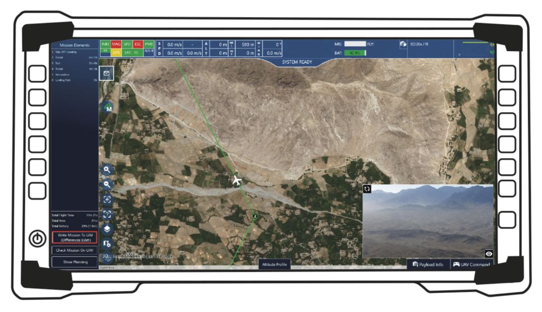 操作人员只需要在任务界面定义飞行区域,设置任务参数,软件自动生成飞行路径。地面控制站与无人机的数据传输(控制)距离可达15千米,在使用扇形天线后可将指挥和控制范围增加到25千米。