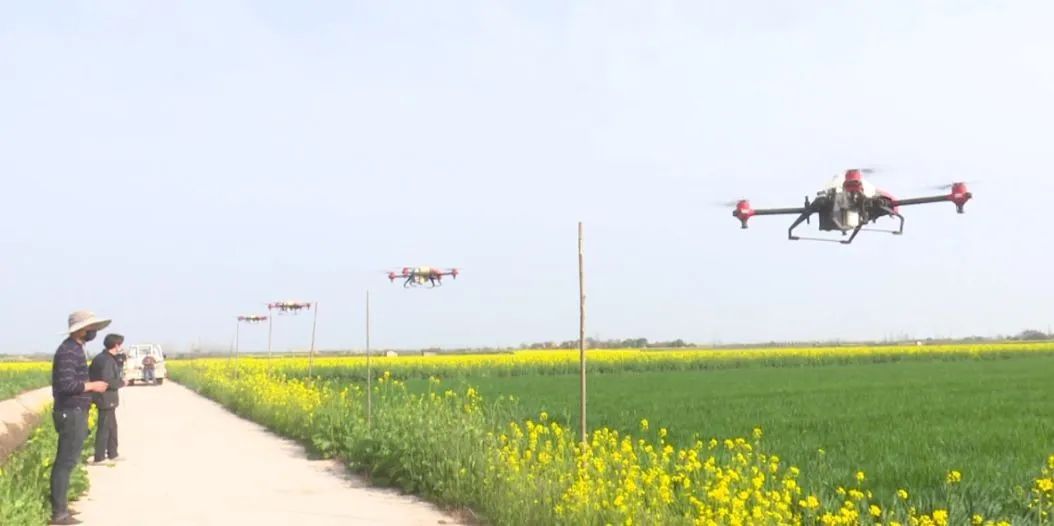 为了确保全镇 3.5 万亩油菜、3.7 万亩小麦丰产丰收工作抓紧落实,当阳市河溶镇政府实行了一个统防统治的办法,从专业植保合作社调集了 18 台植保无人机,进行无人机飞防,每天作业量可以达到 15000 亩左右,不到一周就可以把镇上的油菜、小麦全部进行一次统治。