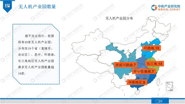 我国现有49家无人机产业园,其中,其中,环渤海、长三角地区无人机产业园最多无人机产业园数量超10家。三大因素驱动无人机产业园产业发展。