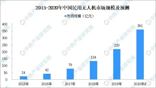 其中,民用无人机凭借着易部署、安全、便捷等特点,不仅能在消费层面上,提供航拍、竞技等娱乐活动,同时在工业层面上能提供数据采集,运输物品的功能。目前,无人机主要应用领域为物流、能源、农业、警用、基建、救灾、商业、医疗以及个人使用。据数据显示,2015年中国民用无人机市场销售规模达到24亿元。随着无人机应用领域的逐渐扩大,无人机市场需求逐渐提升,2018年突破100亿元大关达134亿元,2019年市场规模约为220亿元。国内民用无人机市场潜力十足,预计2020年市场规模将超360亿元。
