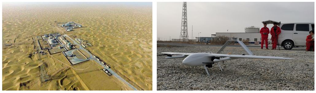 西北油田管线巡检项目,石油管线巡查频次高,距离远,且地处戈壁滩平原地区,使用插翅虎M8-P搭载金眼彪X1,飞行高度可降低至80米进行长距离视频巡查,飞行效率是多旋翼的2~3倍。