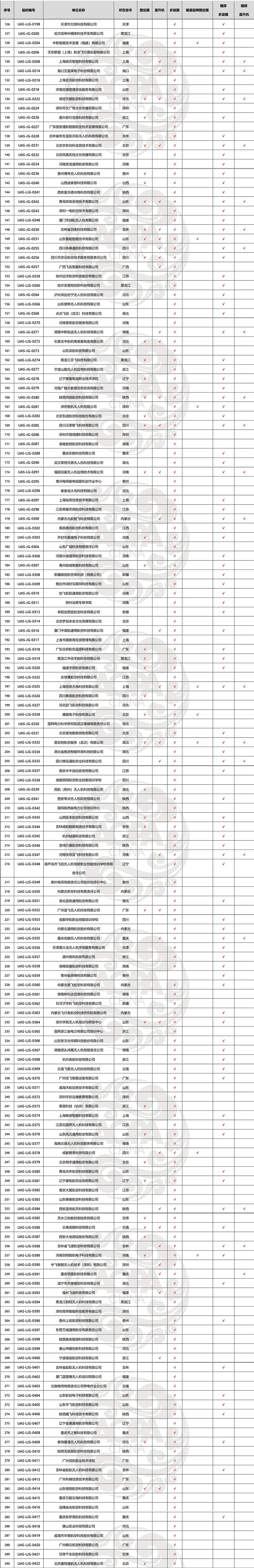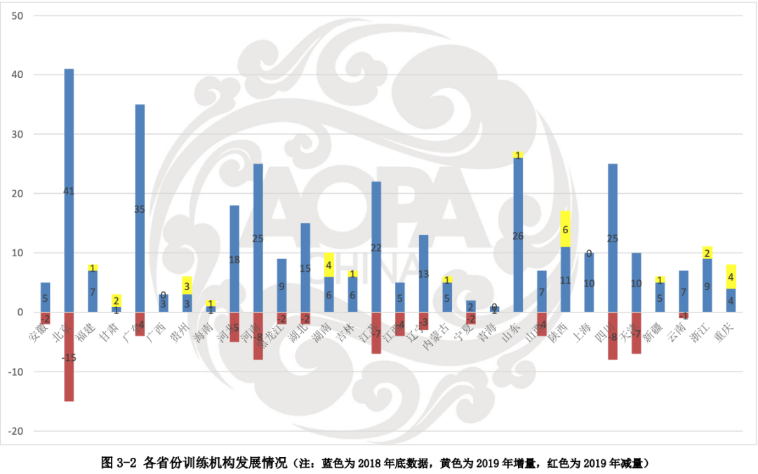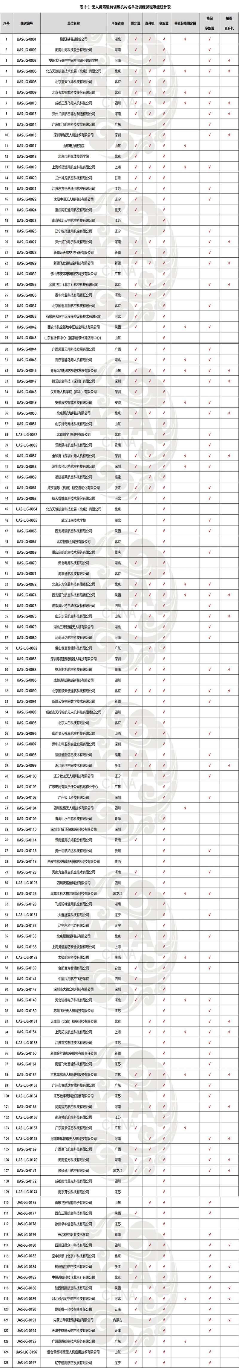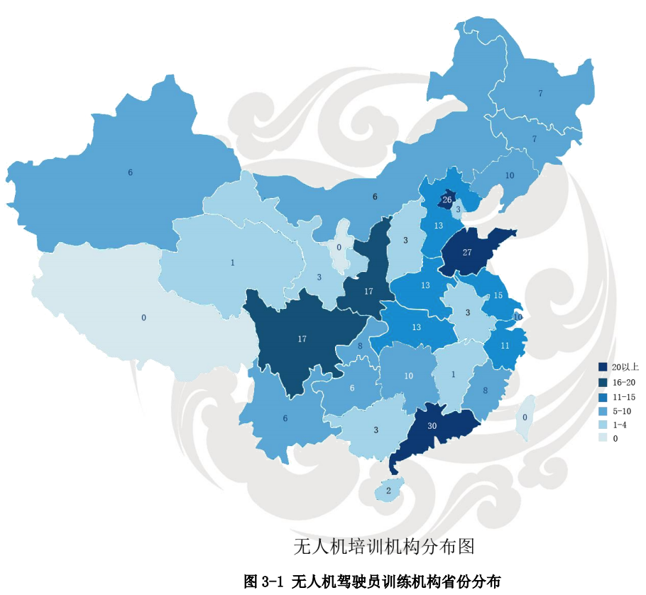 学员就业方向为:17.22% 的毕业学员应用于航空拍摄领域;13.89%学员在农林植保行业使用无人机;14.83% 学员毕业进入电力巡线行业;13.2%应用于地理信息测绘;以下依次为 7.43%警 用;7.33%无人机培训;6.43%消防;4.15%应急救援;1.28%物流运输,还有 5.71% 其他应用方向。除此以外的 8.53%,未能较准确统计出其毕业去向。根据《民用无人机驾驶员训练机构合格审定规则》,截止 2019 年 12 月 31日,共 422 家无人机驾驶员训练机构(以下简称:训练机构)经中国 AOPA 审定合格取得过培训资质,其中暂停运行或注销 132 家,其余 290 家训练机构现具备培训资质。表 3-1 列出了无人机驾驶员训练机构名单及其课程的类别等级,图 3-1 体现了训练机构省份分布,图 3-2 体现了训练机构 2019 年内不同地区发展情况。