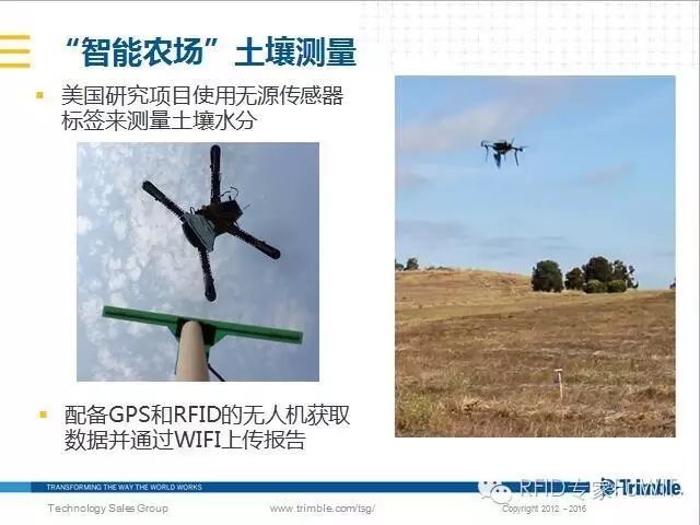 Daniel首先分享的是Trimble正在与Google在美国试点“智能农场”土壤测量项目。在该项目中,将无源传感器标签插入到土壤中,利用带有传感器的标签来测量土壤水分,使用配备GPS和RFID的无人机来读取标签采集的数据并通过WIFI上传报告。
