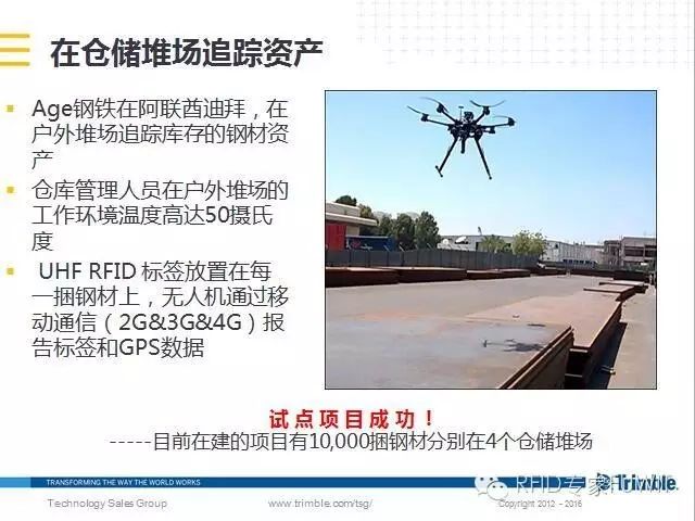 在阿联酋迪拜,Age钢铁公司则利用无人机加RFID技术在户外堆场追踪库存的钢材产品。由于阿联酋迪拜的室外环境比较恶劣,尤其是在夏季,室外温度可以达到50摄氏度,让仓库管理人员难以忍受。Age将UHF RFID标签放置在每一捆钢材上,对无人机进行GPS编程,就能通过移动通信(2G&3G&4G)报告标签数据。该项目已经在Age的4个仓储堆场成功应用。
