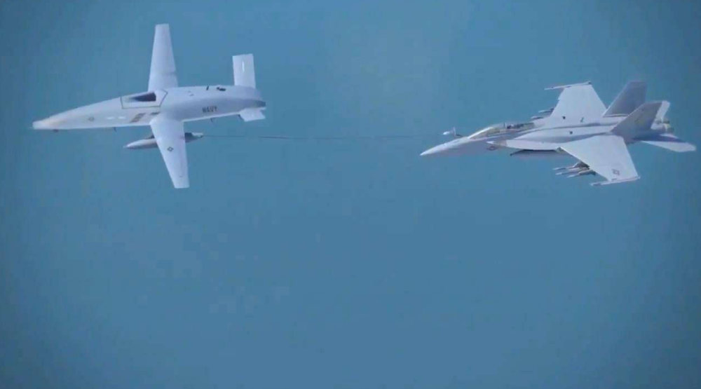 图为MQ-25对大黄蜂战机进行燃料补给