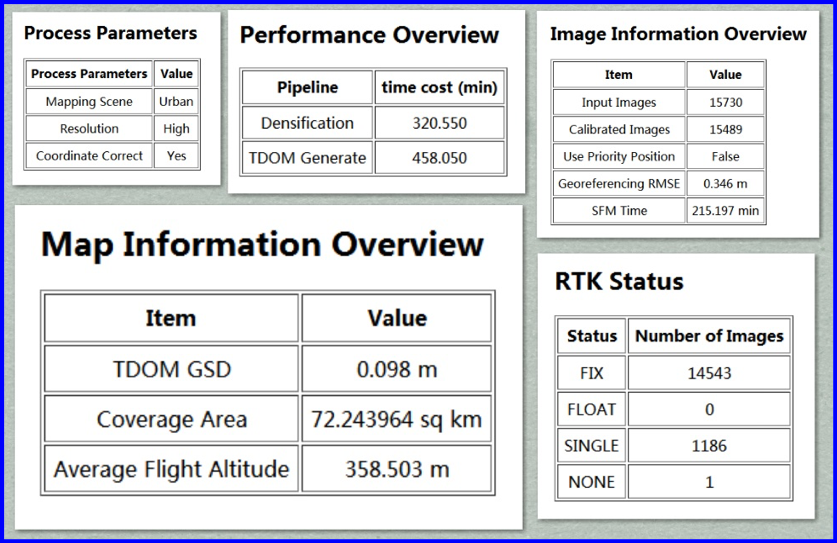 本次采用「一控双机」获取的15730张照片,使用64G内存电脑即可一键式进行正射影像生产,建模仅花了994分钟,数据一次性处理完成,成果满足精度要求。